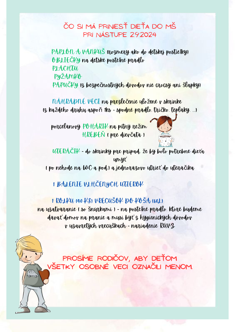 ČO SI MÁ PRINIESŤ VAŠE DIEŤA DO MŠ PRI NÁSTUPE